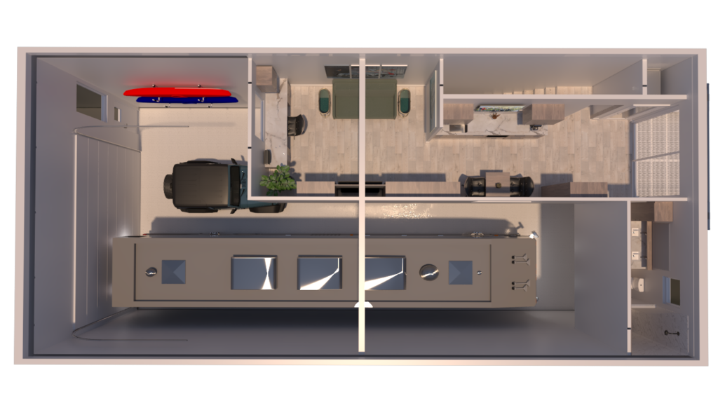 - An optional wet bar and workbench arrangement can be added under the stairs to their mezzanine.